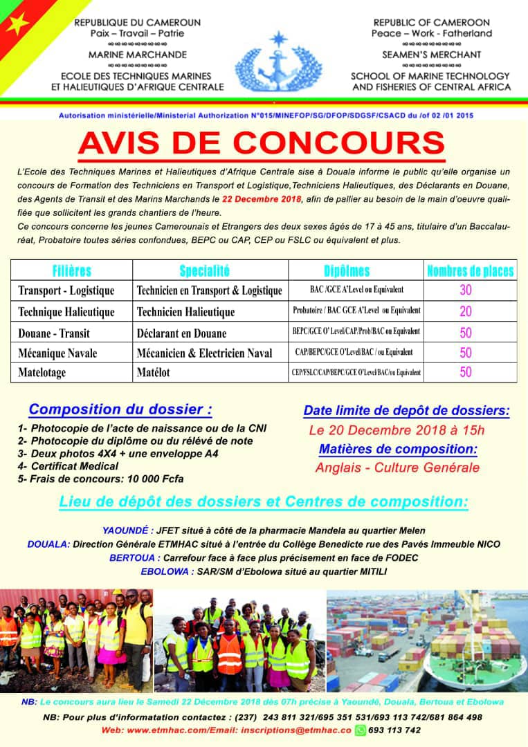 L’Ecole des Techniques Marines et Halieutiques d’Afrique Centrale sise à Douala organise un concours de formation des Techniciens en Transport et Logistique, Techniciens Halieutiques, Déclarants en Douane, Agents de transits et des Marins marchands. Les candidats doivent être titulaires d’un Baccalauréat, Probatoire toutes séries confondues, BEPC ou CAP, CEP ou FSLC ou équivalent.