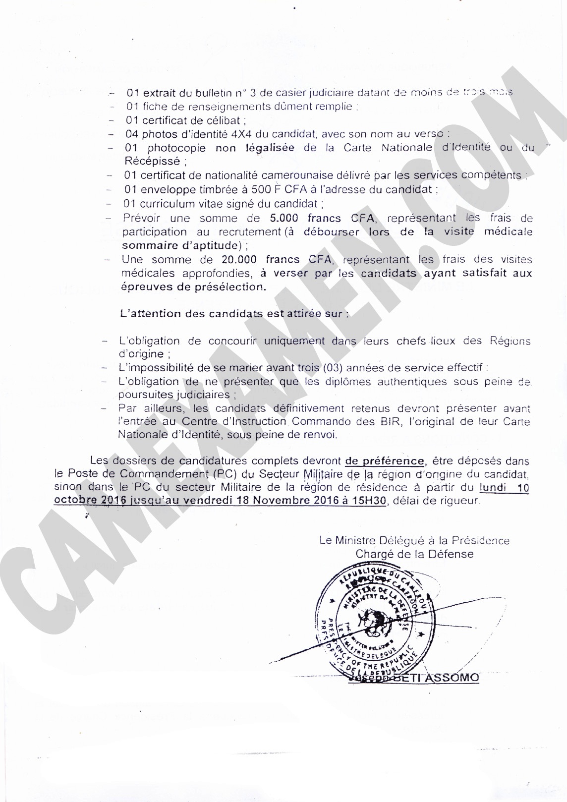 Il est porté à la connaissance des jeunes camerounais de sexe masculin, désireux de faire carrière dans les Forces de Défense, qu’un recrutement spécial de 1 800 commandos d’élites au profit les Bataillons d’Intervention Rapide (BIR), aura lieu du 07 Janvier au 16 Février 2017 dans les chefs-lieux des régions d’origine des candidats.